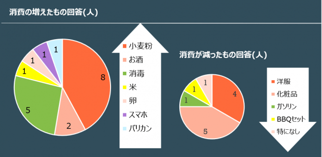 調査によると、消費が増えたものは、小麦粉、酒、消毒、米、卵、スマホ、バリカンとなった。